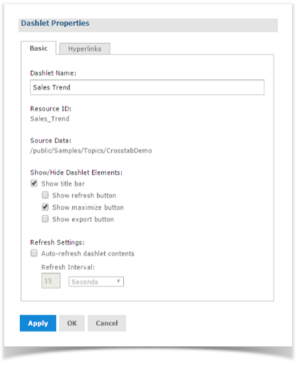 Show/Hide Dashlet buttons: select or deselect to show or hide the Apply button or Reset button.
