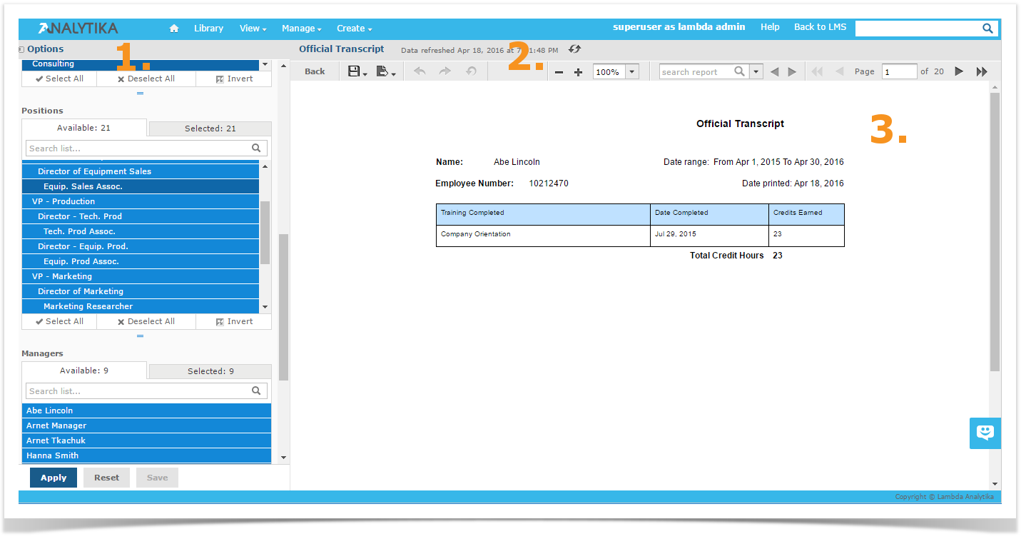 - The Options column contains all of the designated filters included with the report. Use these sets of filters to select the necessary data to be displayed in the Report. Click Apply or Reset to save or revert your changes.